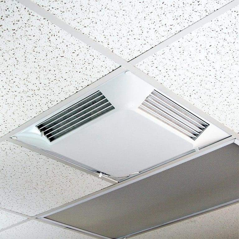 Ceiling with a Comfort First Filtered Diffuser, featuring a square white air vent panel next to tiled ceiling panels.